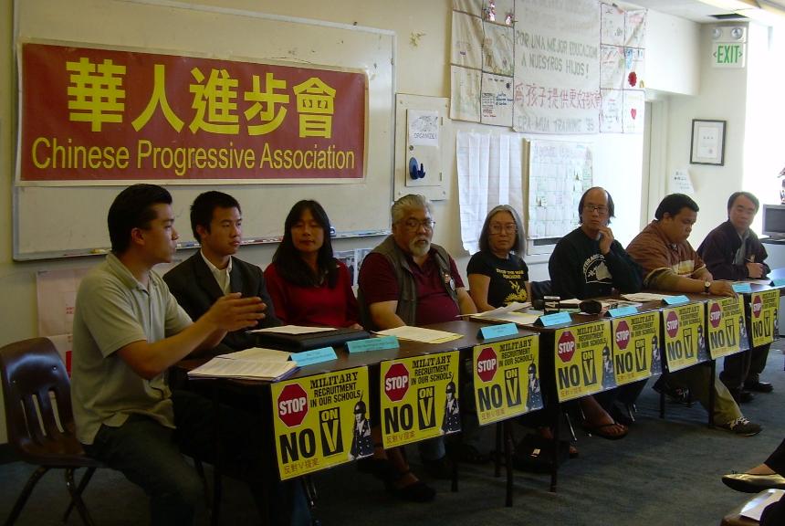 (Above, left to right: Alex Tom, CPA; Chuck Chan, former Washington High School JROTC cadet; Yuen Mei Wong, parent of two Lowell High School students; Peter Yamamoto, Asian Americans for Peace and Justice; Joyce Umamoto, ANSWER; Michael Wong, Veterans for Peace & former Galileo High School JROTC cadet; Marko Matillano, Alliance for a Just and Lasting Peace in the Philippines; Leon Chow, SF Labor Council & SEIU UHW)